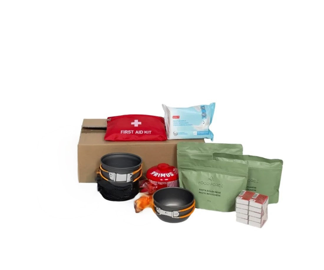 Komplekt sisaldab potikomplekti, priimust, niisked salvrätikud, tikud, esmaabikomplekti ja 1 päeva toitu. Kindlusta oma ohutus ja heaolu!