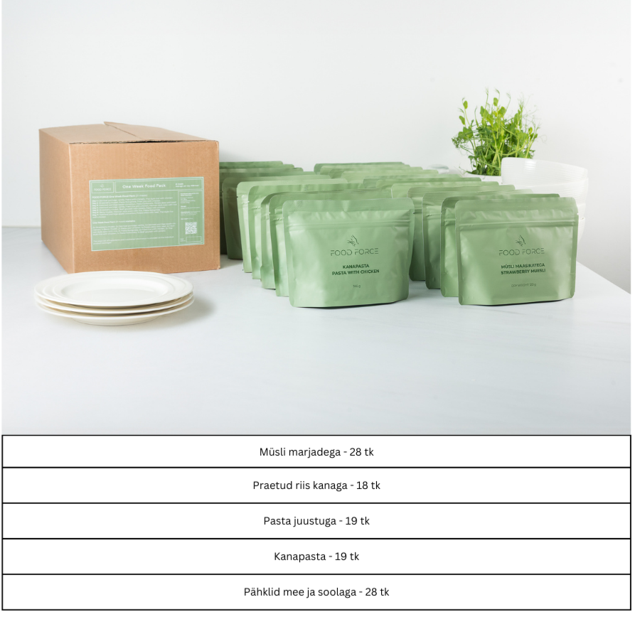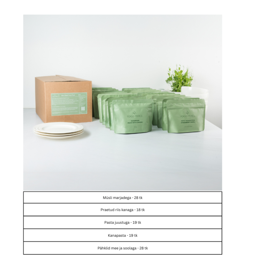 Komplekt sisaldab iga valitud inimese kohta toitu valitud ajavahemikuks, pakkudes igaks päevaks hommiku-, lõuna- ja õhtusööki ning magustoitu. Oleme mõelnud, et toit oleks võimalikult maitsev, toitaineterikas, pika säilivusajaga aga ka võimalikult kerge kaasas kanda.