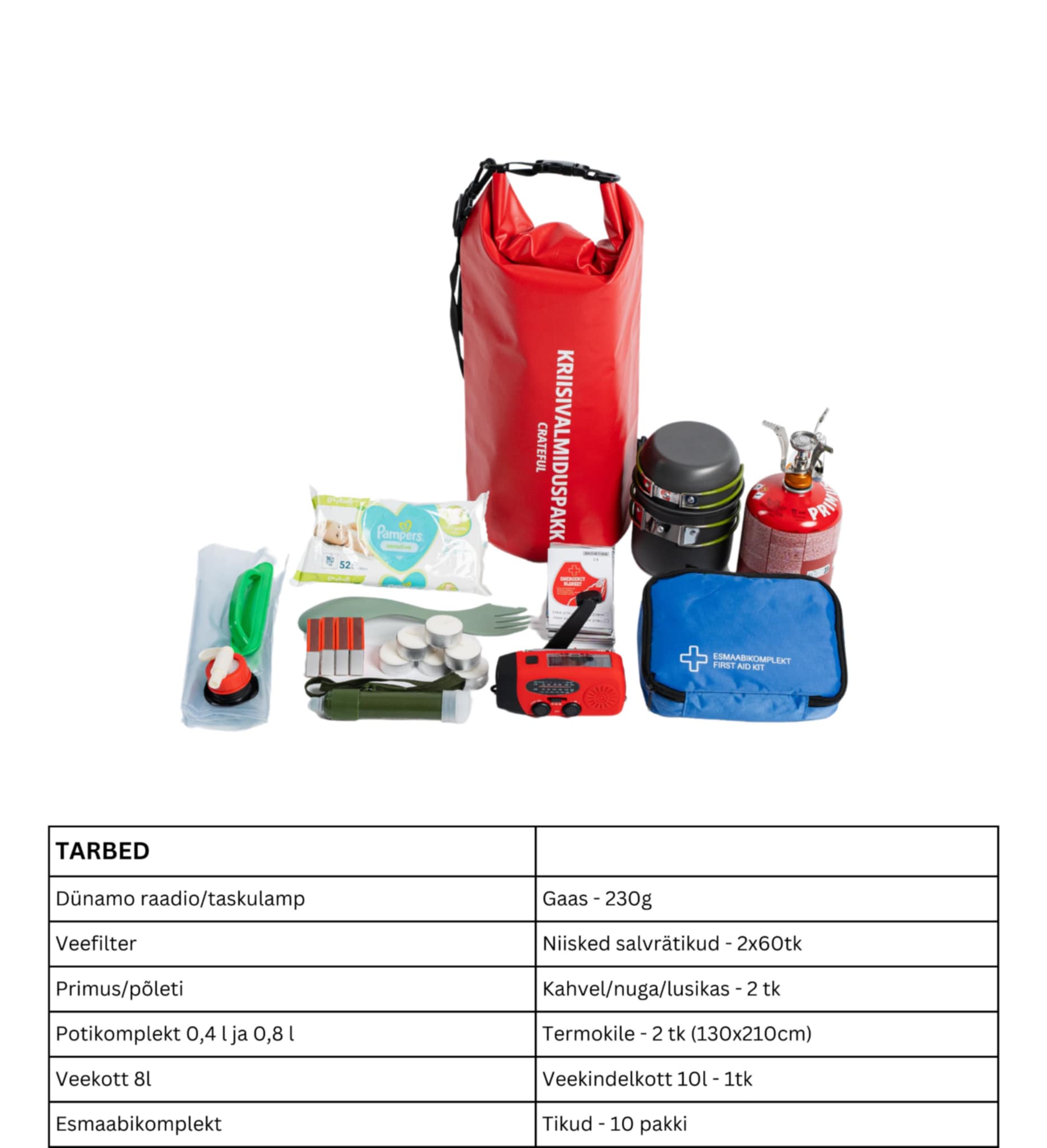 Kriisivalmiduspakkide sisu on loodud koostöös Päästeameti, Kaitseministeeriumi ja Naiskodukaitsega.